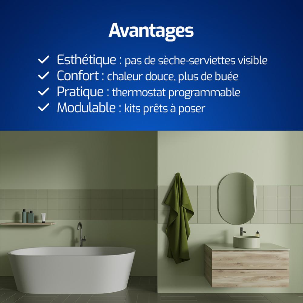 Confort mural : Unique sur le marché, ce système peut s'installer sur les murs d'une salle de bain (pour chauffer la zone de douche ou créer un porte-serviette invisible).
