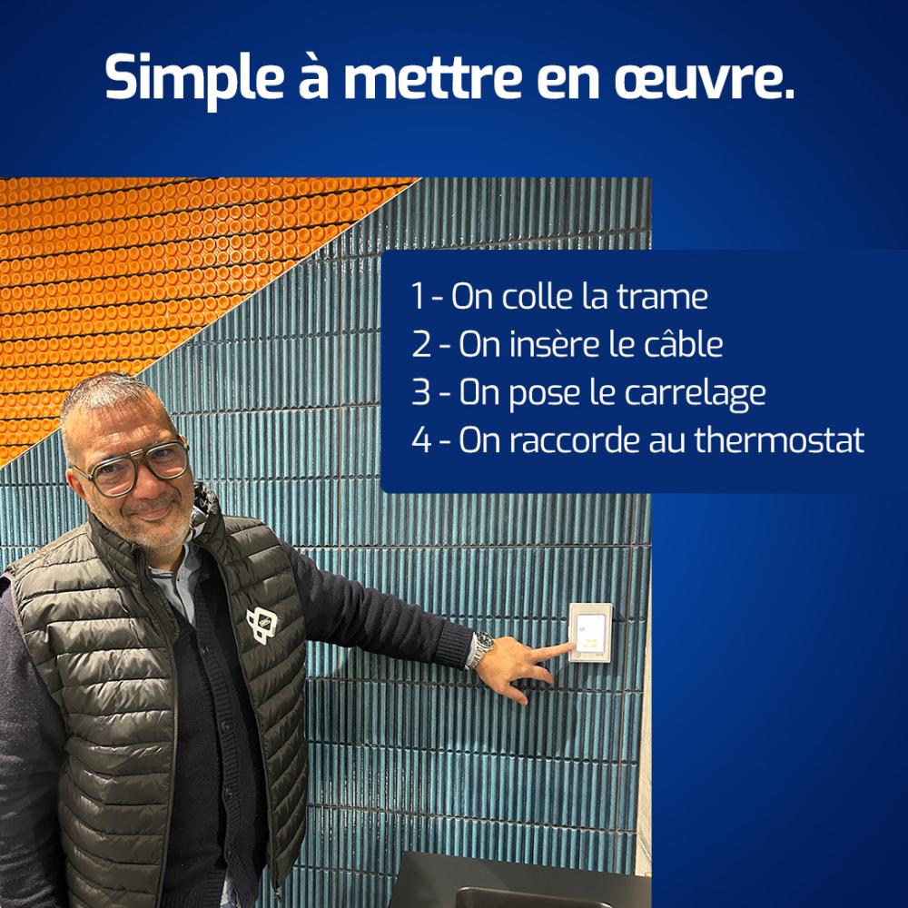 Réactivité thermique : Les câbles de chauffage s'insèrent directement dans la natte, permettant une montée en température ultra-rapide.
